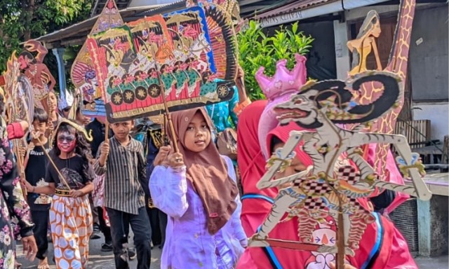 Karnaval wayang diikuti puluhan anak-anak. Mereka mengenakan pakaian tradisional. Masing-masing membawa wayang. Dari wayang kulit dengan tokoh-tokoh pewayangan kuno, juga wayang dari hewan hingga superhero yang terbuat dari kertas.