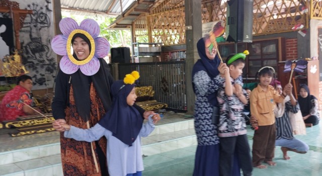 Ada satu yang membacakan cerita, sementara anak-anak lain memerankan berbagai warna kupu-kupu yang berinteraksi dengan bunga, dibantu sejumlah guru yang bertopengkan bunga.